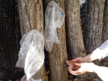 しいたけ菌を打ち込んだ原木から、大きなしいたけを収穫しました。