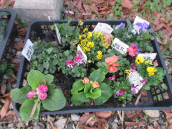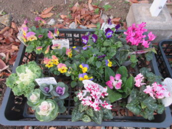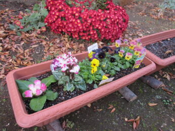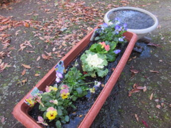 シクラメン・パンジーなどの花、チューリップの球根を植えました。